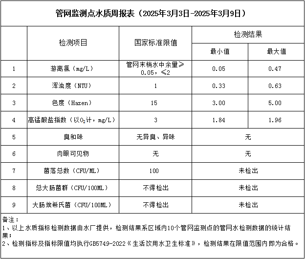 管網監測點水質周報表(2025年3月3日-2025年3月9日)