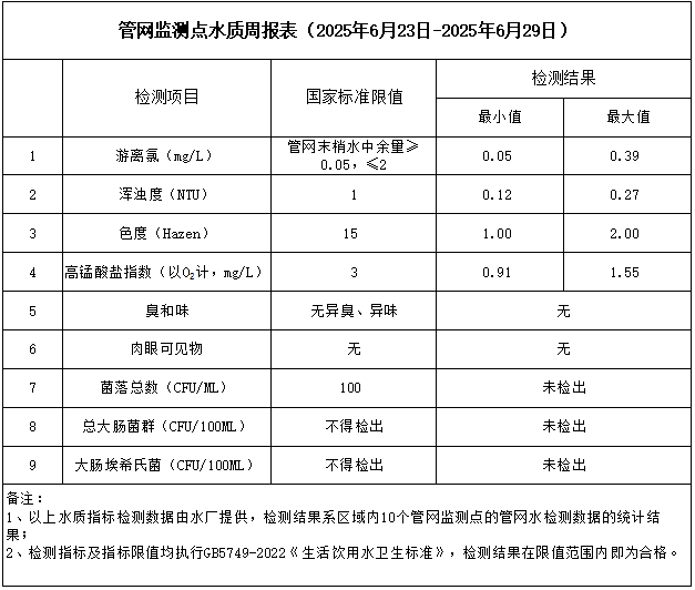 管網監測點水質周報表(2025年6月23日-2025年6月29日)