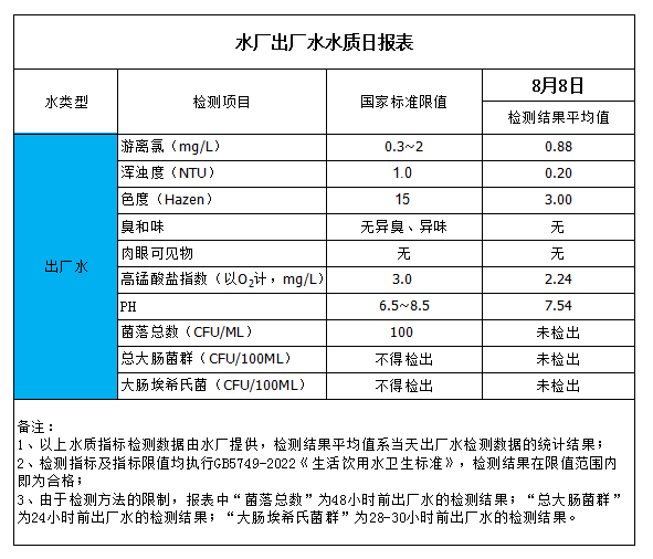 水廠出廠水水質(zhì)日報(bào)表(2023-8-8)