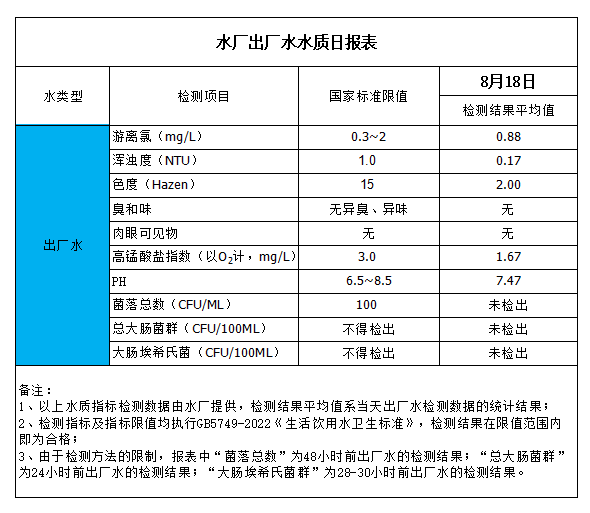 水廠出廠水水質日報表(2023-8-18)