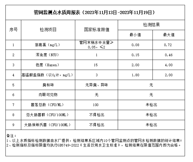管網監(jiān)測點水質周報表(2023年11月13日-2023年11月19日)