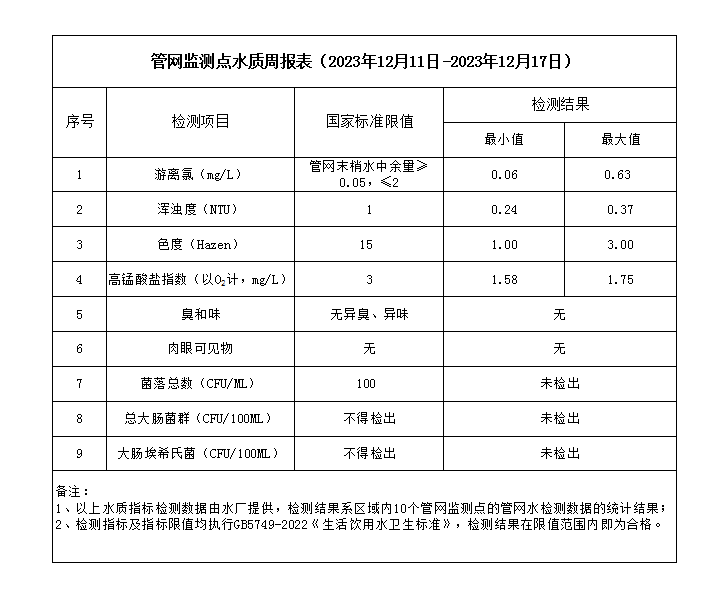 管網監測點水質周報表(2023年12月11日-2023年12月17日)