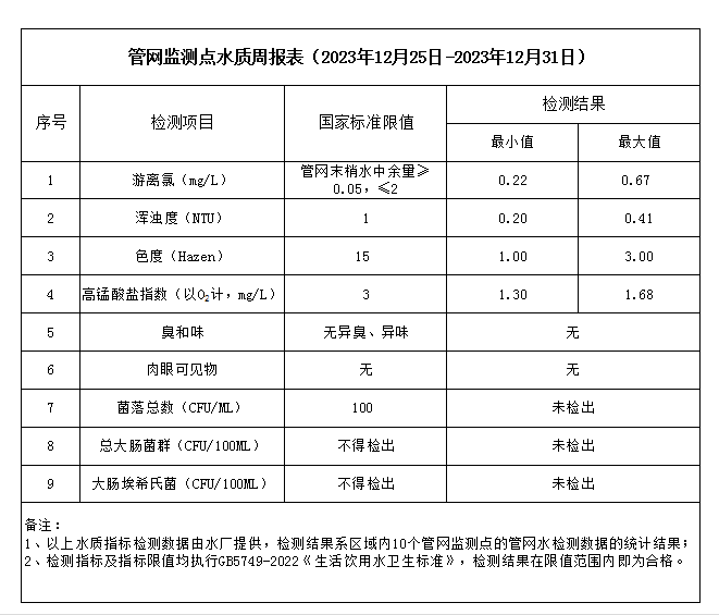 管網(wǎng)監(jiān)測(cè)點(diǎn)水質(zhì)周報(bào)表(2023年12月25日-2023年12月31日)