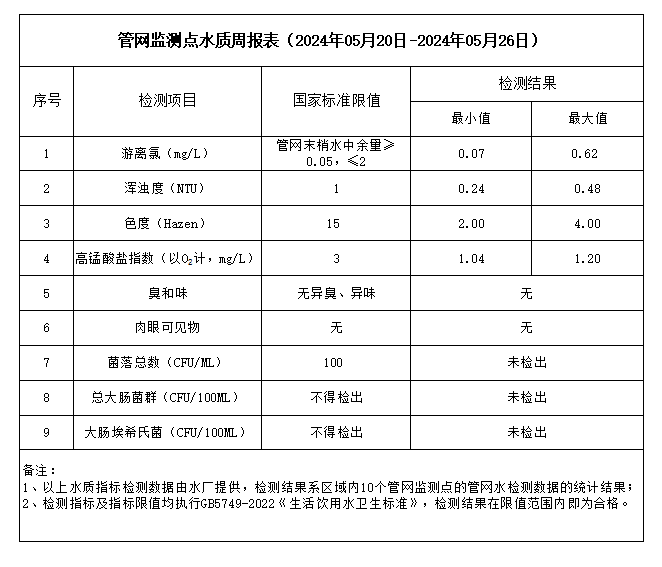 管網監測點水質周報表(2024年05月20日-2024年05月26日)