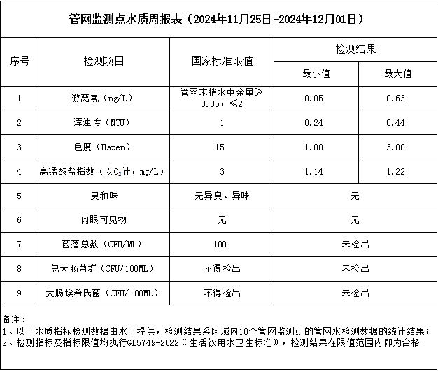 管網(wǎng)監(jiān)測(cè)點(diǎn)水質(zhì)周報(bào)表(2024年11月25日-2024年12月1日)